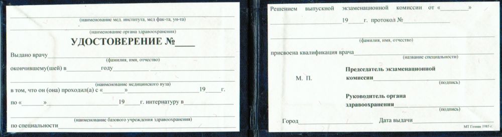 Если вы решите купить удостоверение интернатуры или ординатуры образца 2005-2012 года, обратите внимание на его оформление и убедитесь в том, что оно выполнено на подлинном бланке. Бланк документа заключен в твердую обложку зеленого цвета, на лицевой стороне которой содержится название документа (надпись «Удостоверение»). Разворот удостоверения выполнен в розово-зеленом цвете и состоит из левой и правой частей. На левой части изображена чаша со змеей, в правой указано название документа, а также индивидуальный номер бланка.
